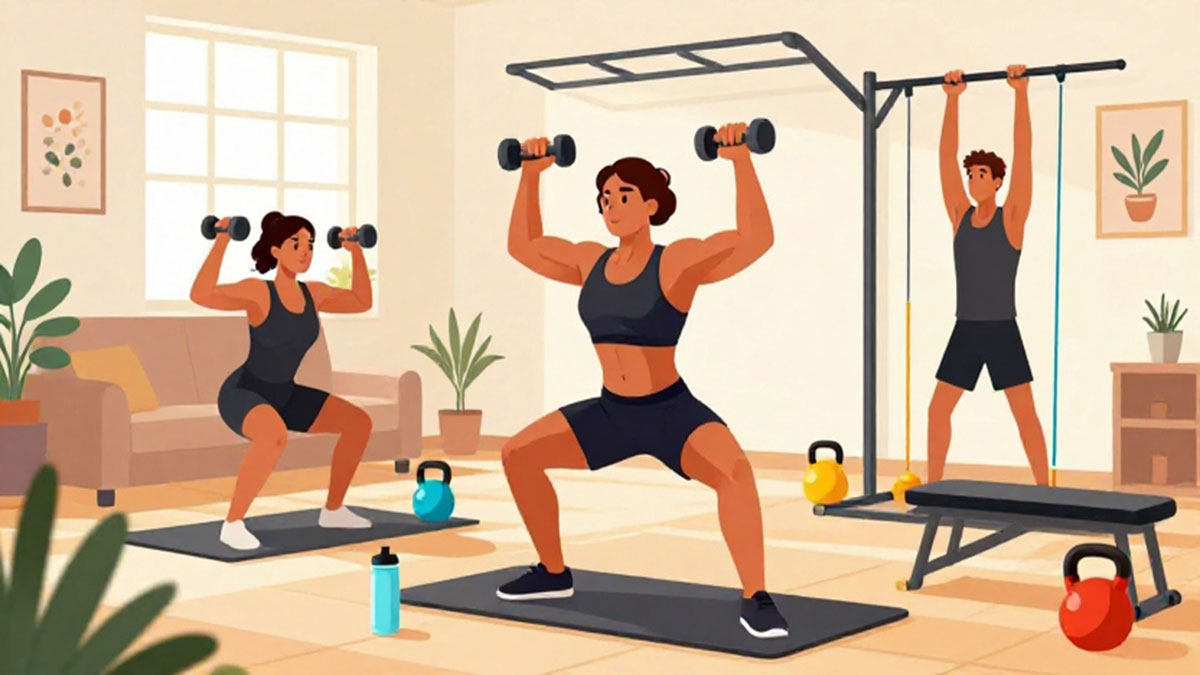 Contoh latihan efektif: push-up, squat, deadlift dengan dumbbell, shoulder press, dan bent-over row.